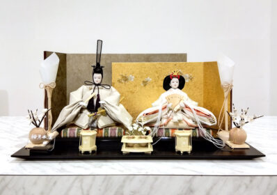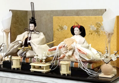 落ち着いたベージュが美しい、洋間にもぴったりなお雛様で左右段違いになっている屏風には、上品なグレーと華やかな金色が織り成すモダンなデザインが際立ちます。和室だけでなく、洋室にもマッチするスタイリッシュなデザインの飾りとなっています。