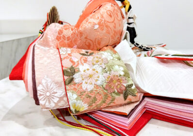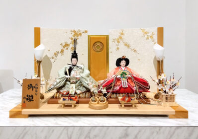 優しい色合いの衣装に施された華やかな桜の刺繍が目を引くお雛様です。洋間にも調和する白木調の飾り台は、上質な檜を使用しており、高級感が漂います。飾り台中央には繊細な千筋細工が施され、繊細な技術が光る仕上がりです。