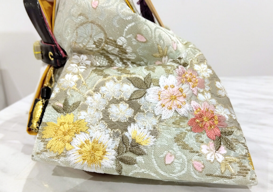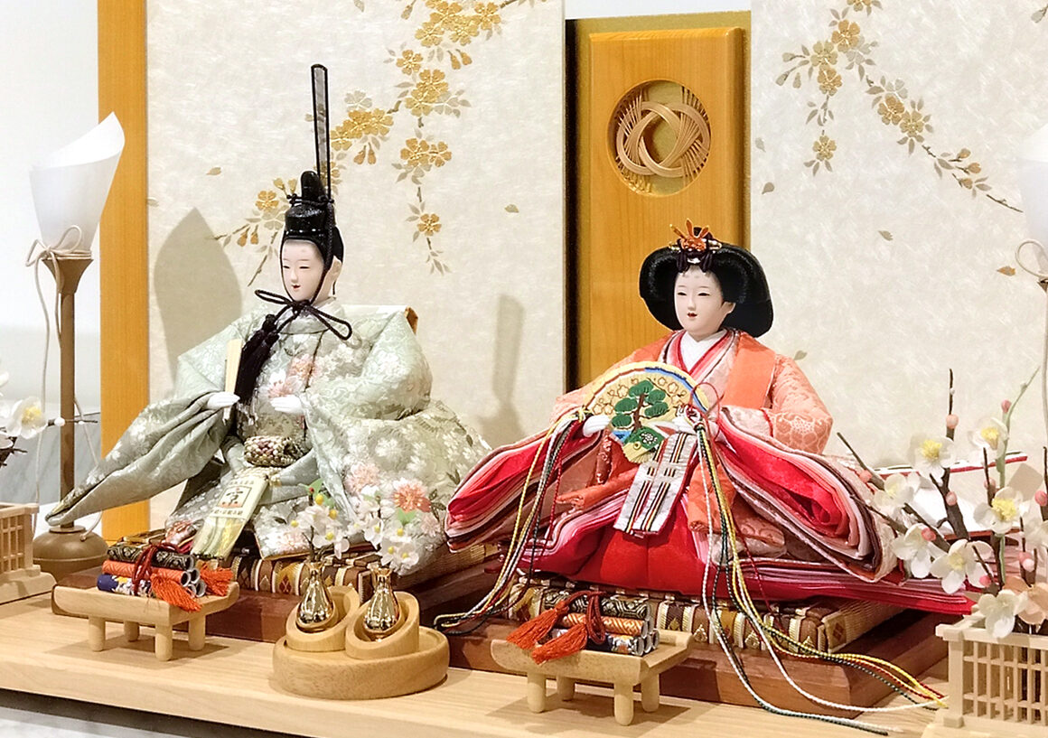 優しい色合いの衣装に施された華やかな桜の刺繍が目を引くお雛様です。洋間にも調和する白木調の飾り台は、上質な檜を使用しており、高級感が漂います。飾り台中央には繊細な千筋細工が施され、繊細な技術が光る仕上がりです。