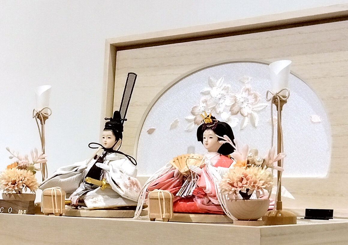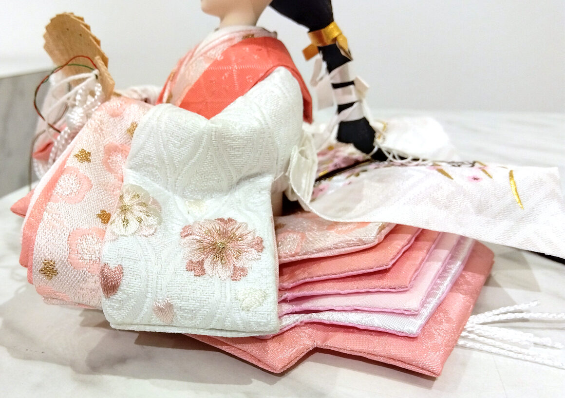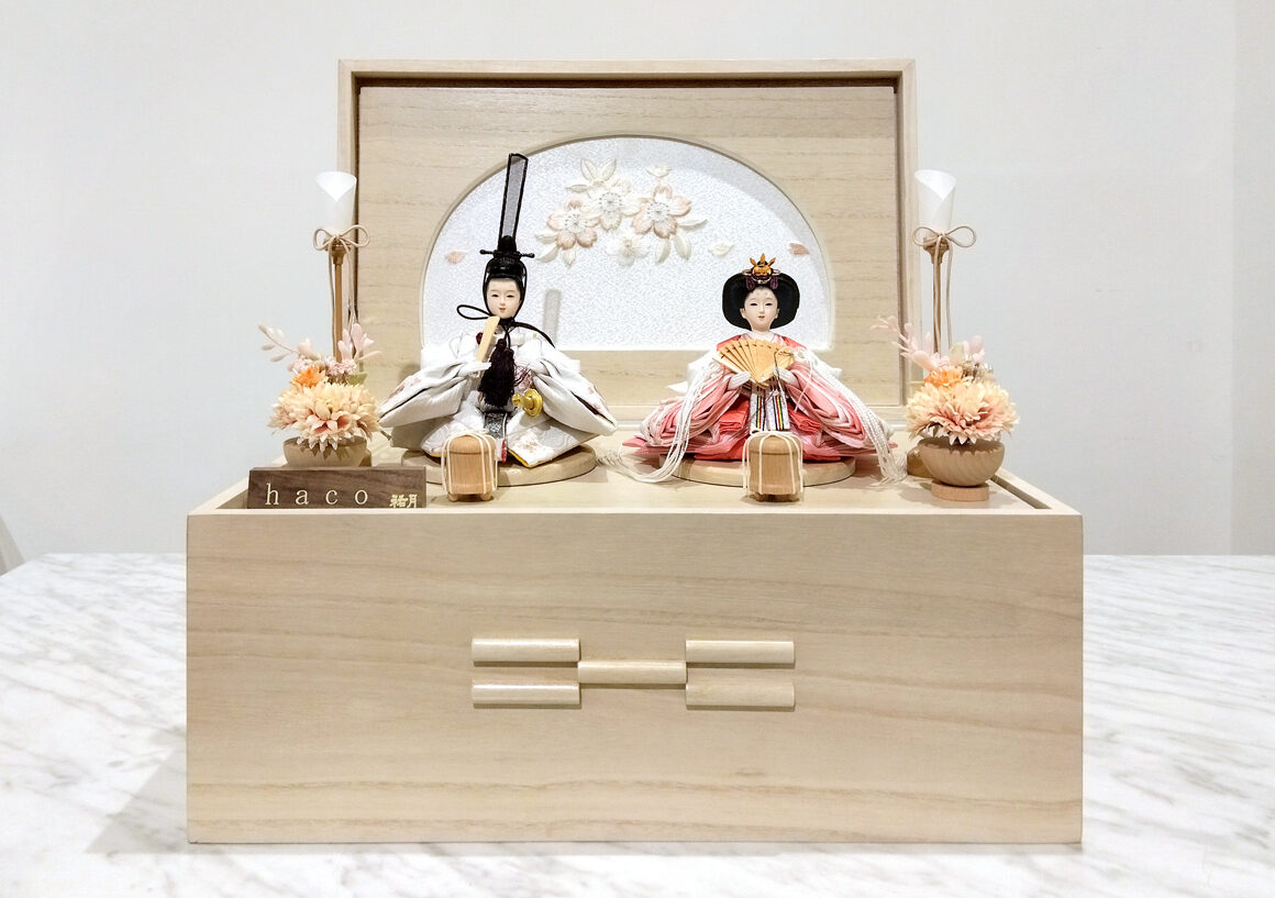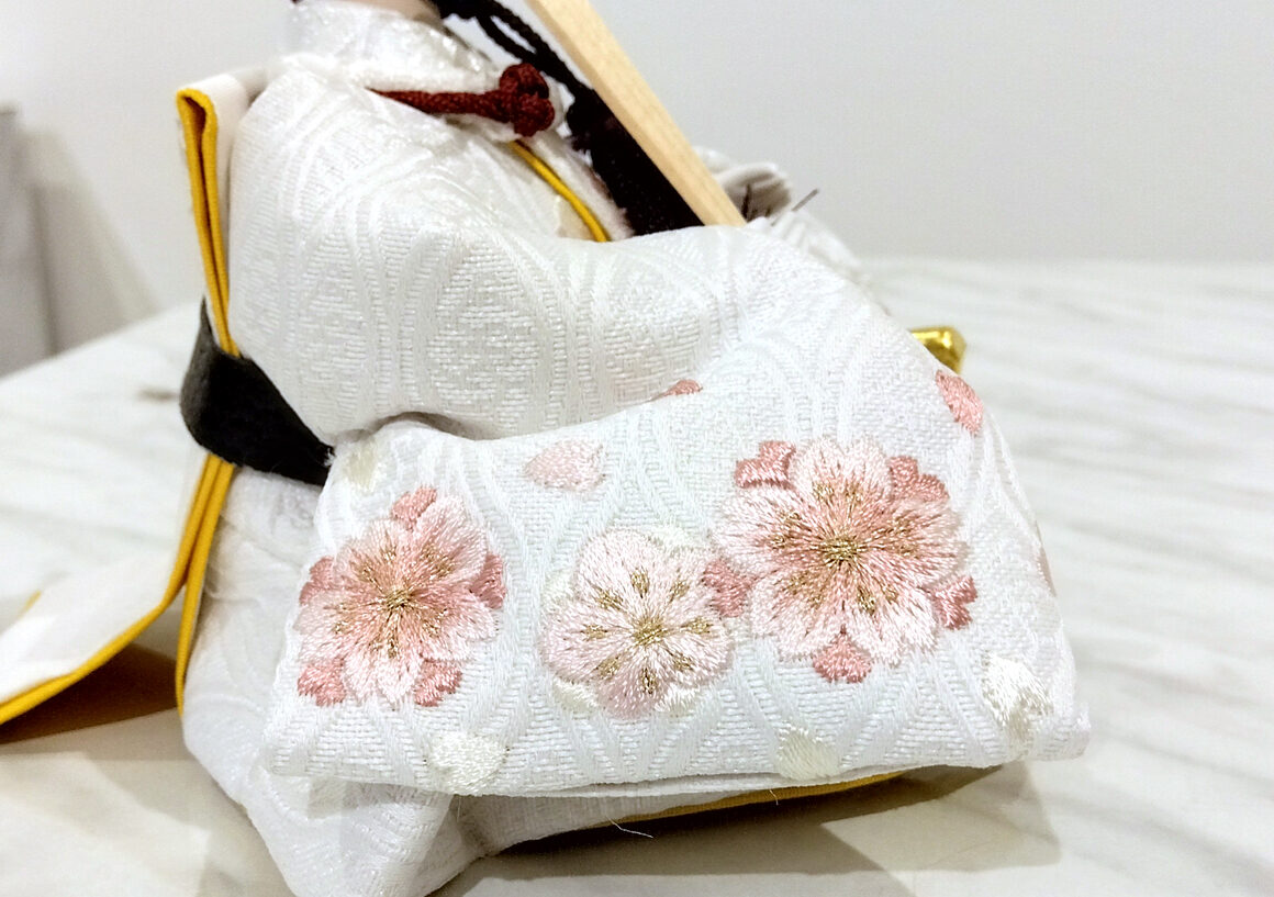 繊細な桜の刺繍が施された可愛らしいお人形と、上品な白木調の収納台が特徴です。お人形の柔らかな表情と風情溢れる桜のデザインは、和の美しさを感じさせます。収納台はナチュラルな色合いで、どんなインテリアにも調和し、一体感のある空間を演出します。
