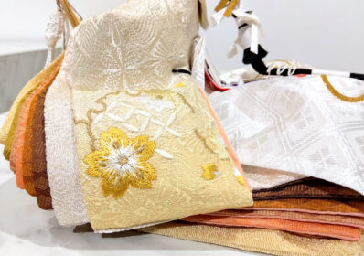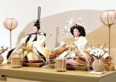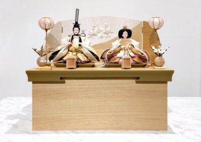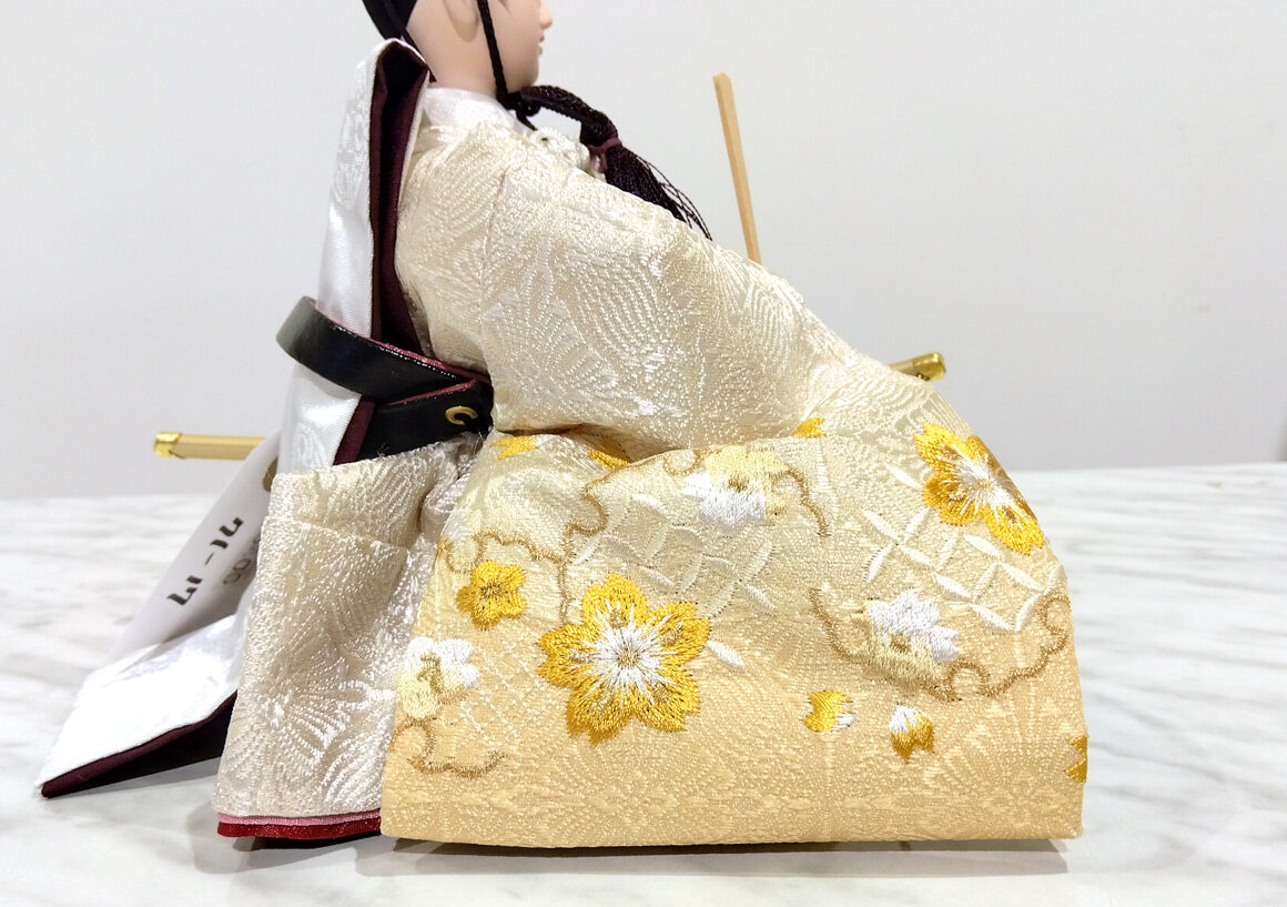 豪華な金色の雪輪桜が美しく刺繍されたお人形は、洋間にもぴったり。ナチュラルな白木調の収納台との組み合わせが、上品な雰囲気を醸し出します。収納台の蓋だけを使い、平飾りとしても楽しめるのもポイントです。