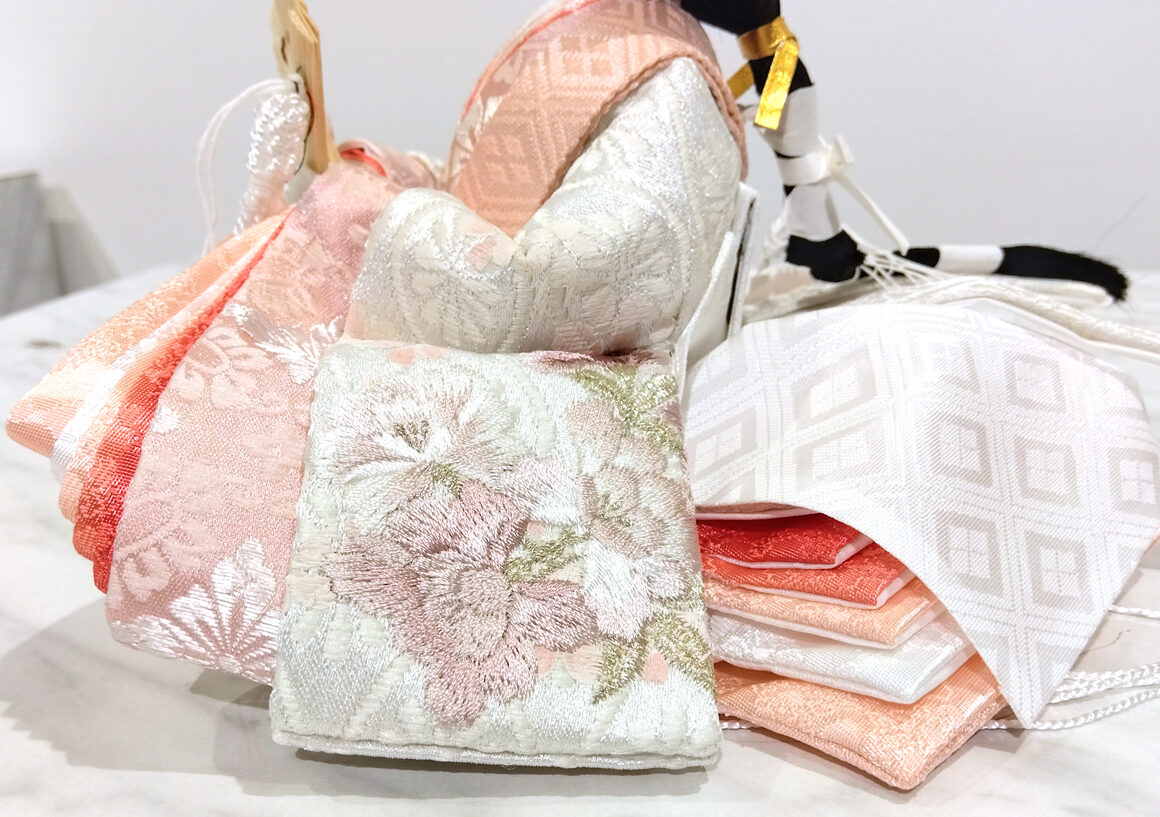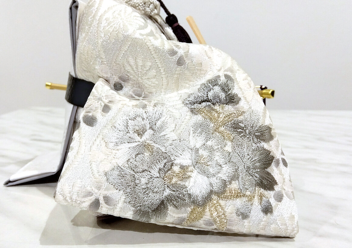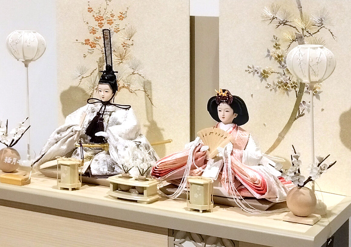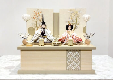 落ち着いた雰囲気のグレーとピンク色が調和した、桜と牡丹が美しく刺繍されたお雛様です。白木とグレーを基調とした収納台が上品な雰囲気を醸し出し、お部屋のインテリアに華を添えます。