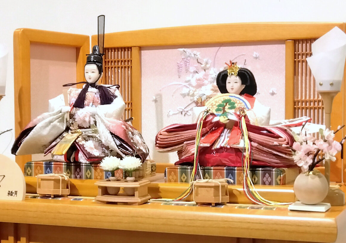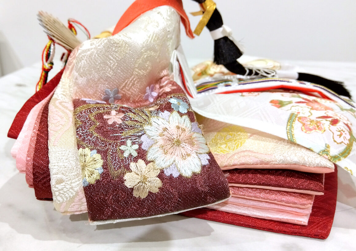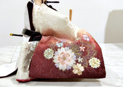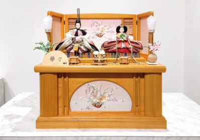 美しい赤紫のグラデーションが特徴のお雛様です。豪華な衣装には色とりどりの桜の刺繍が施され、繊細なデザインが美しさを引き立てます。洋間にも調和するナチュラルな白木調の収納台は、インテリアとも調和し、一層の華やかさを演出します。