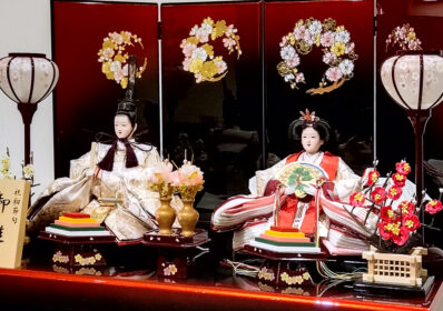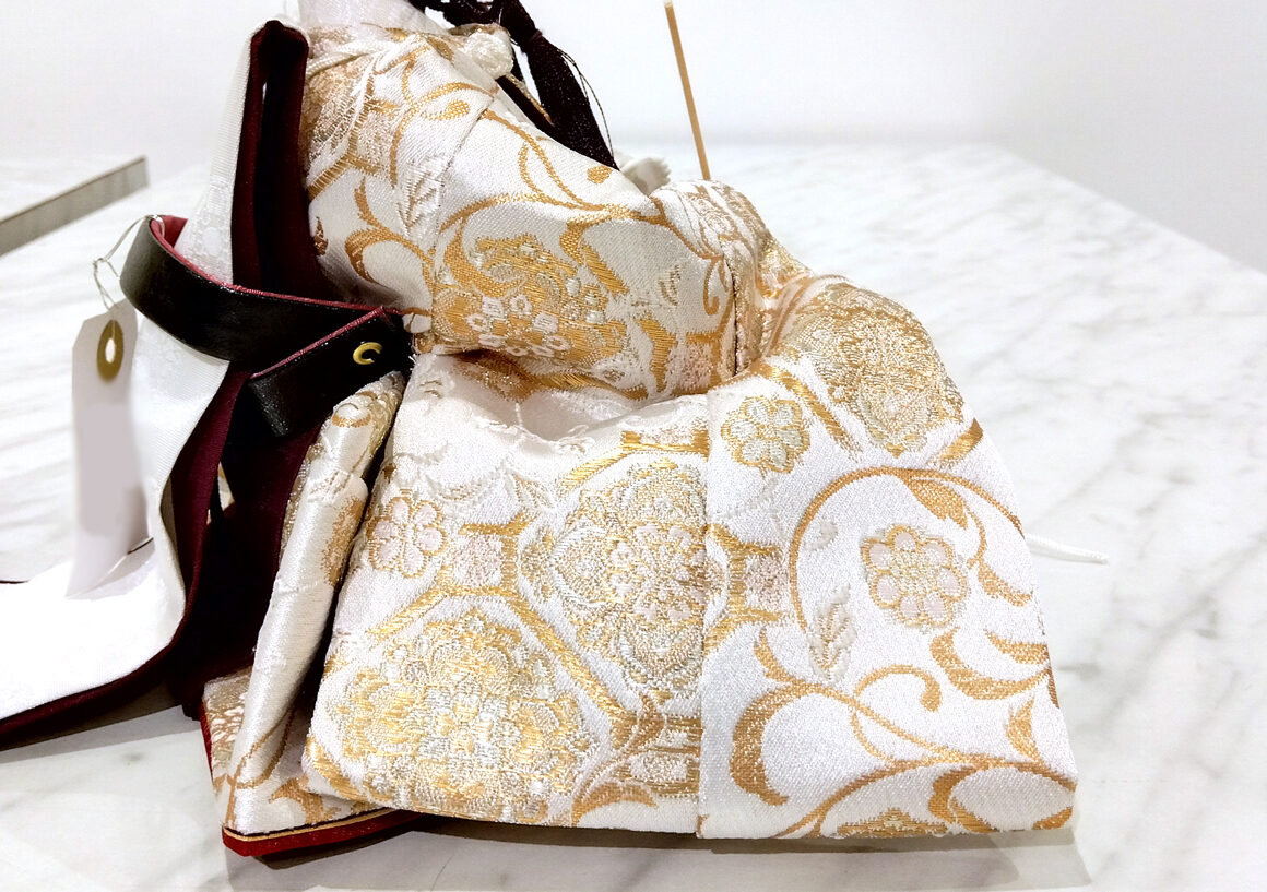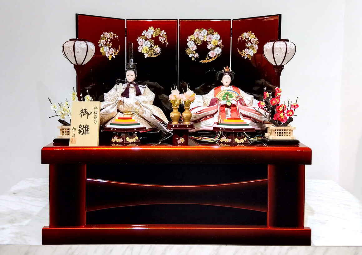 白の衣装に金色の華やかな華紋と唐草が描かれたお雛様です。色鮮やかでまるで漆器のような高級感溢れる塗りの収納台が特徴的で、華やかなお雛様を一層引き立てます。