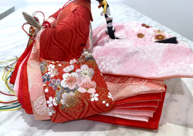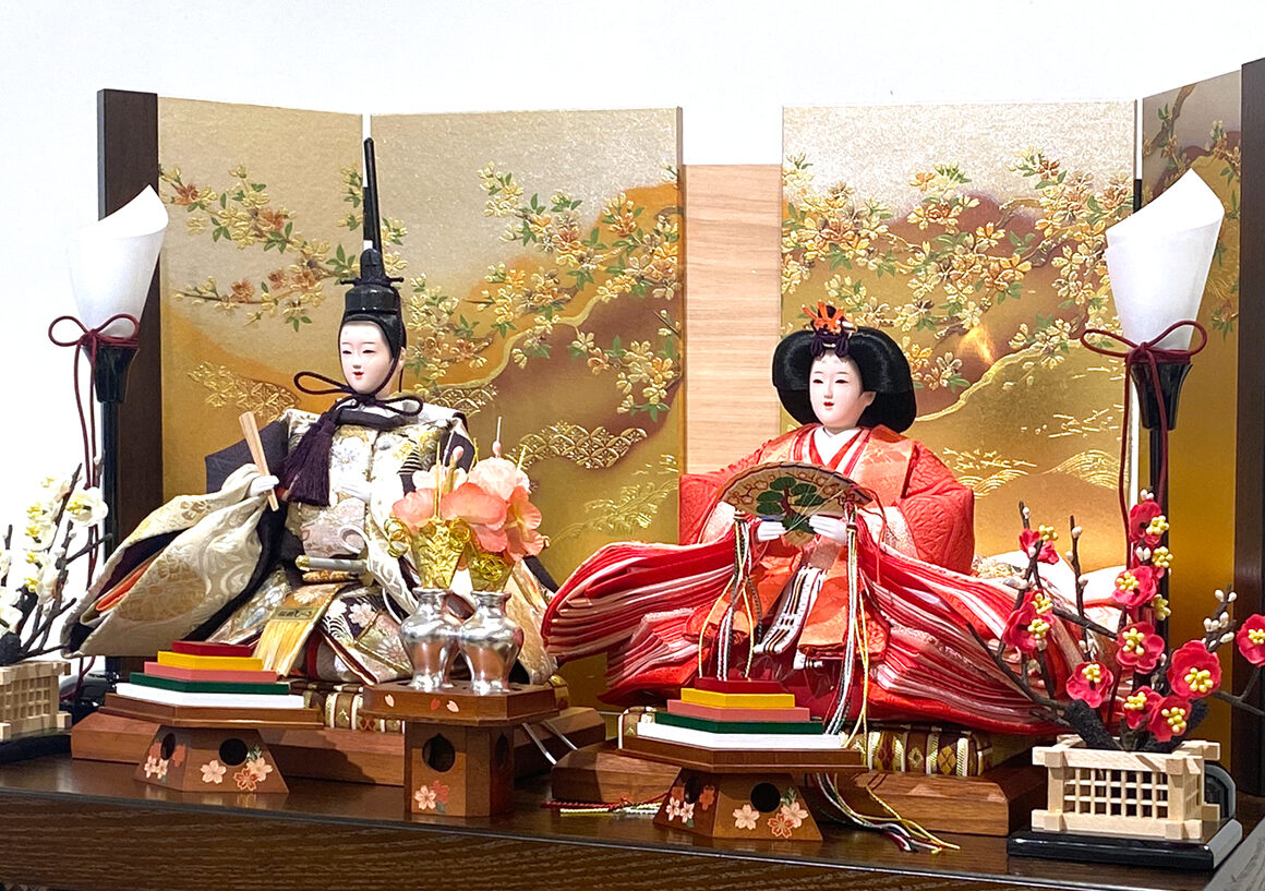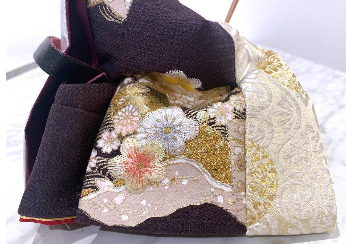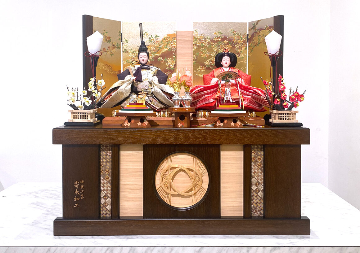 華やかな刺繍の衣装がお雛様を彩るお部屋に趣を添える逸品です。お殿様の袖口には切嵌でもめでたい吉祥文様の生地が施され、高貴な雰囲気を醸し出しています。さらに、木目が美しい収納台は洋間にも調和し、中央に施された繊細な千筋細工は繊細な技術の結晶です。