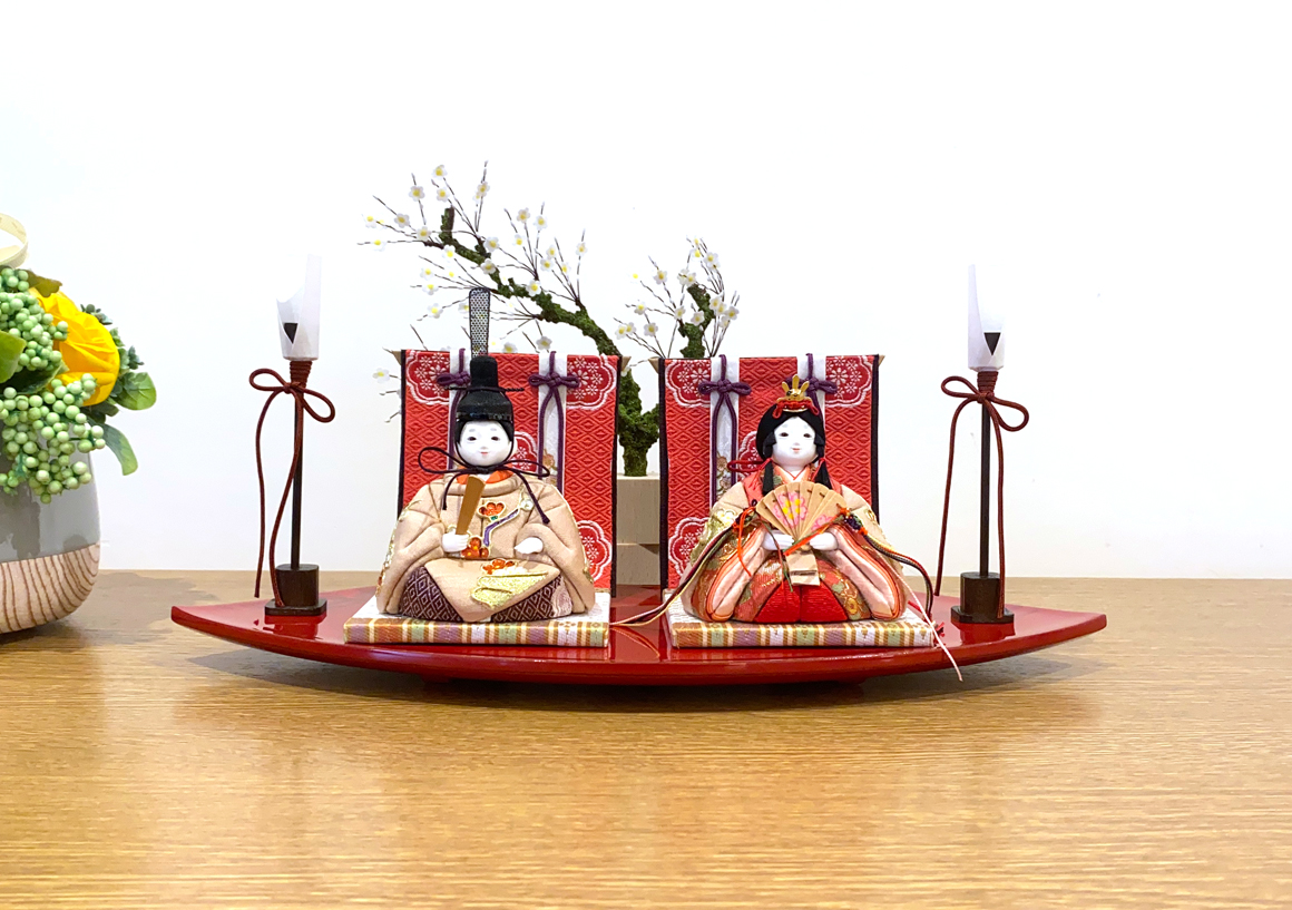 田村芙紗彦作。ベージュと金が優雅に調和し、上品な雰囲気を演出します。衣裳に施された洋花の刺繍は繊細で美しく、一層の華やかさを与えます。また、メタリックレッドの収納台がアクセントとなり、存在感のあるデザインとなっています。