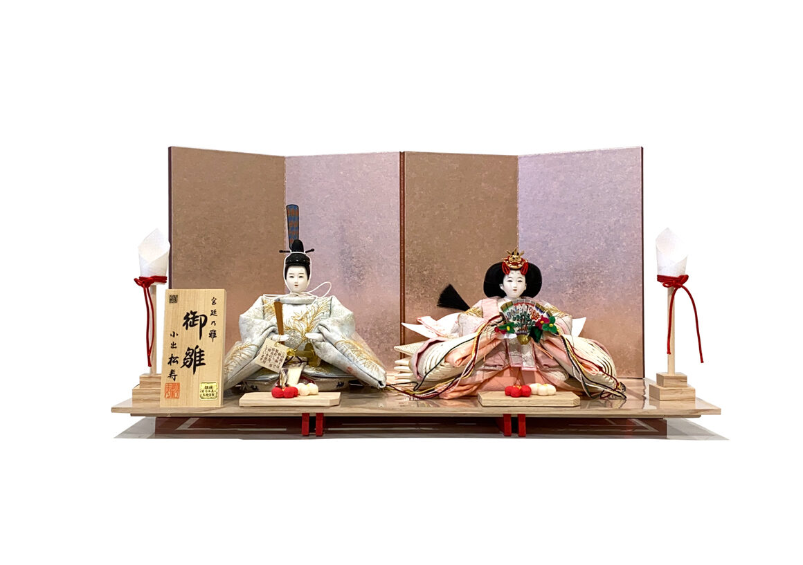 小出松寿作。吉兆の鳥とされる孔雀の羽根を金銀の糸で華やかに描いたお祝いにふさわしい縁起の良い御衣裳のお雛様です。可愛らしくも洗練されたメタリックピンクのお屏風がお人形の華やかさをより際立てます。