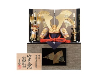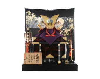 純金鍍金の金具を使用し、吹返しには本革、鉢は本物同様の剝ぎ合わせ鉢になっており、本格仕様の兜飾りです。美しい塗りが特徴の収納台にはラメが散りばめられており、重厚感ある兜を煌びやかに彩ります。