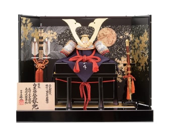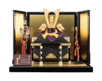 黒と金を基調としたスマートなデザインが兜の美しさを引き立てます。コンパクトに出し入れが可能な収納飾りになっており、和洋お部屋を問わずお飾りいただけます。