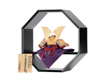 吹返しに取り付けられた輝く銅の彫金細工が特徴的な兜です。収納台は和洋を問わず、どんな場所にも馴染むナチュラルな白木調の物で兜同様に精巧な麻の葉の組子細工が施され、職人の技術と美意識が光る兜飾りとなっています。