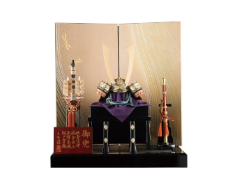 また、あえて装飾なく黒一色に塗られた収納台と輝く金箔の屏風が、兜の重厚さをより深めている高級感ある飾りとなっています。
