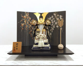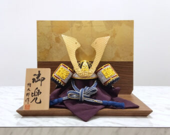 黒とダークブラウンを基調とした落ち着いた風合いの兜とウォールナットの飾り台の組み合わせです。兜には銀杏が描かれ、銀杏は末広がりな葉の形状から開運招福、富貴繁栄の縁起物とされています。
