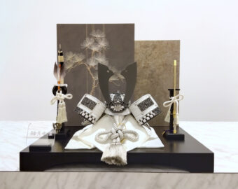 白と黒の配色が絶妙に調和し、繊細なディテールが魅力的な兜になっており、正絹縅や合わせ鉢等、職人の技術が光る逸品となっています。グレーとシルバー基調の飾り台がモノトーンな兜をさらに際立たせています。