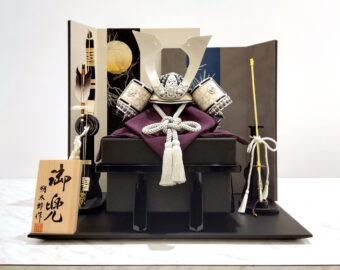 洗練されたシルバーカラーの兜で吹き返しには上質な印伝革が使用され、伝統とモダンが見事に融合した逸品となっています。正絹縅や合わせ鉢等手の込んだ造りになっており、職人の技が光る兜です。さらに、飾り台は2枚構成のお屏風がシックなデザインで兜を引き立てスタイリッシュな兜飾りとなっています。