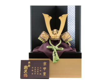 優しい黄緑を基調に、純金箔押された小札や同じく純金鍍金処理がされた飾り金具、白木の兜櫃等明るく華やかな風合いの兜です。シンプルなオークの飾り台が兜のより際立てます。
