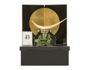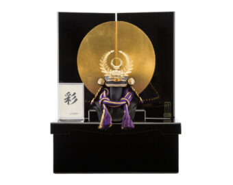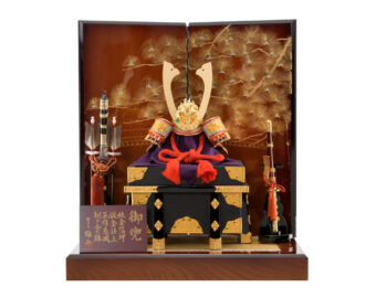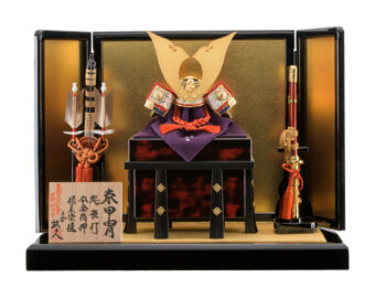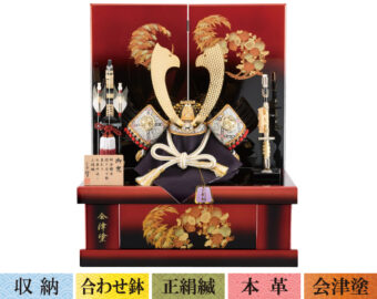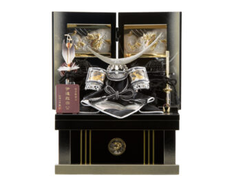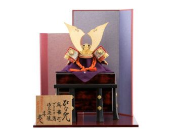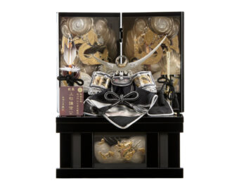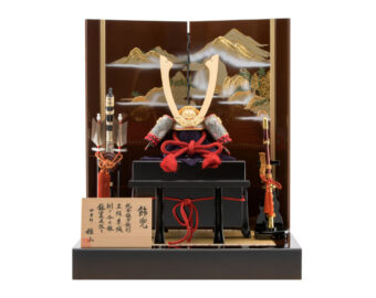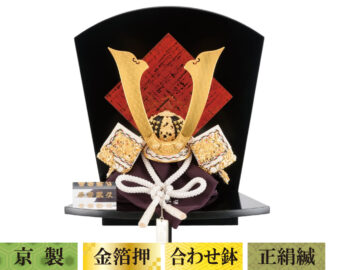 洗練されたシルバーカラーの兜で吹き返しには上質な印伝革が使用され、伝統とモダンが見事に融合した逸品となっています。正絹縅や合わせ鉢等手の込んだ造りになっており、職人の技が光る兜です。さらに、飾り台は2枚構成のお屏風がシックなデザインで兜を引き立てスタイリッシュな兜飾りとなっています。
