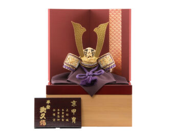 紺と白の縅色が美しく、頭部の鉢は短冊状の板を幾重にも重ね合わせ美しい丸型に仕上げた合わせ鉢になっています。コンパクトな木目調の飾り台と合わせ、シンプルですが重厚感ある兜飾りとなっています。