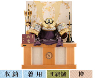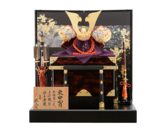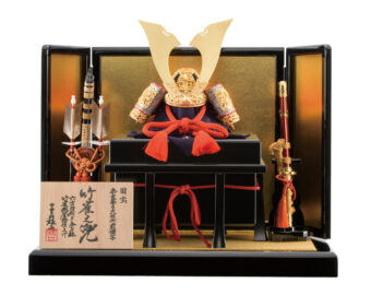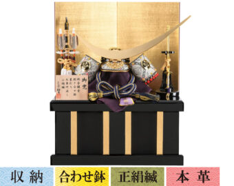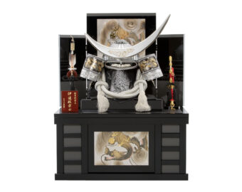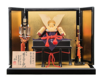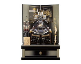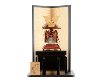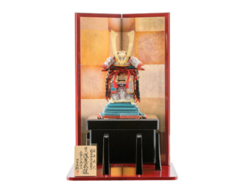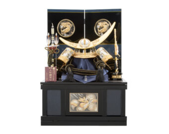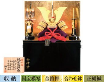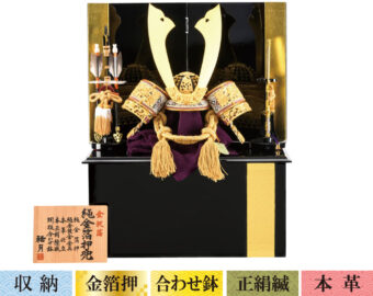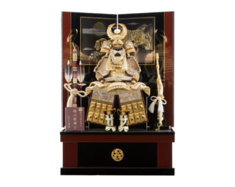 通常の金よりもより柔らかく落ちついた風合いのあるシャンパンゴールドの鍍金を施した兜です。収納式の飾り台は木目の美しさを生かした前面両開き式の物を採用、上品なシャンパンゴールドの兜を際立たせるスタイリッシュな飾りとなっています。