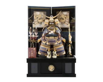 紺と白の縅色が美しく、頭部の鉢は短冊状の板を幾重にも重ね合わせ美しい丸型に仕上げた合わせ鉢になっており、重厚感ある本格仕様の兜飾りです。特徴的な四角推のライトは和紙が張り付けられ、電池式にてLEDが発光します。