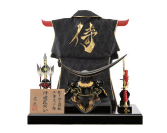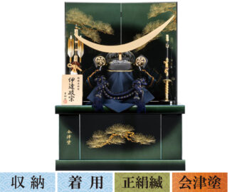 もっとも特徴的なシンボルであり兜そのものの倍はあろうかという長さの三日月の前立てやスタイリッシュな黒塗りの兜等、猛将で知られ人気の高い伊達政宗の兜が良く再現されています。台は収納式でコンパクトに出し入れでき兜と同様の黒塗と金の配色が統一感のある飾りとなっています。