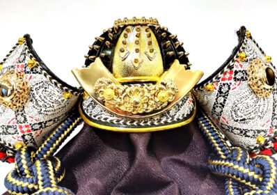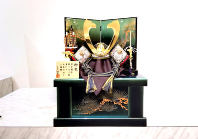 色鮮やかな緑の会津塗の飾り台が美しい兜飾りです。本体の兜も純金鍍金の鍬形や本革の吹き返し、剝ぎ合わせの鉢など、職人によって一切の妥協なく製作された本格仕様の兜になっています。