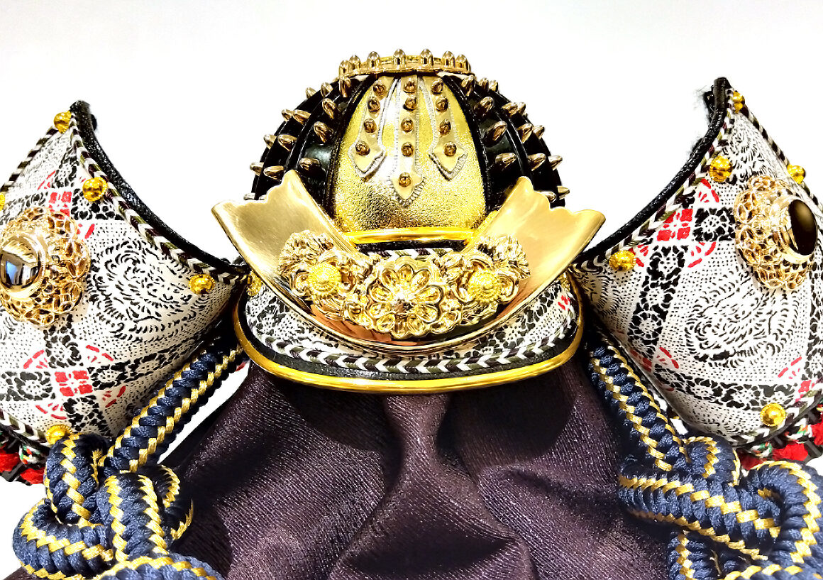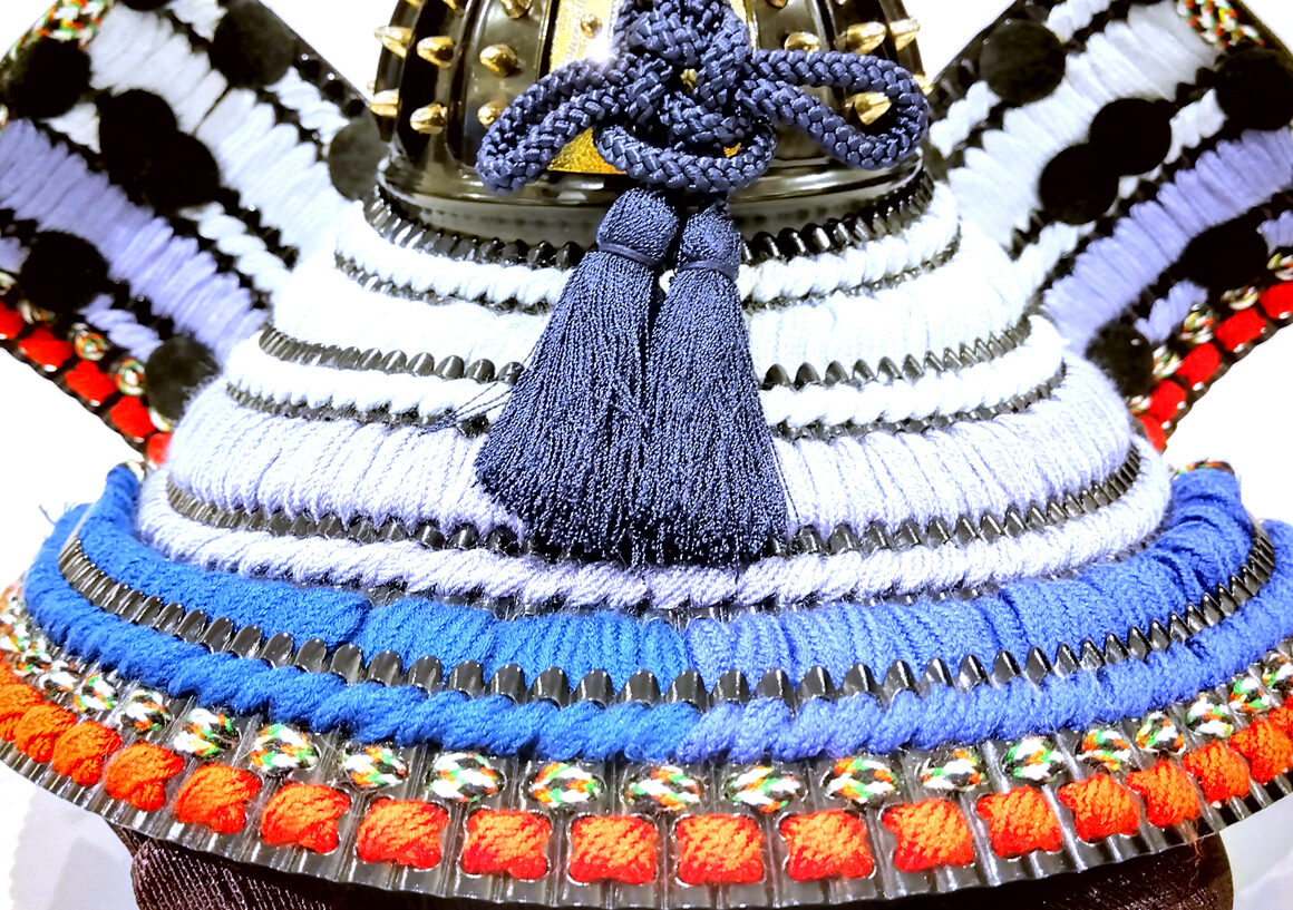 色鮮やかな緑の会津塗の飾り台が美しい兜飾りです。本体の兜も純金鍍金の鍬形や本革の吹き返し、剝ぎ合わせの鉢など、職人によって一切の妥協なく製作された本格仕様の兜になっています。