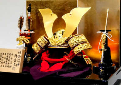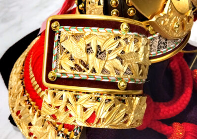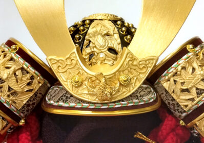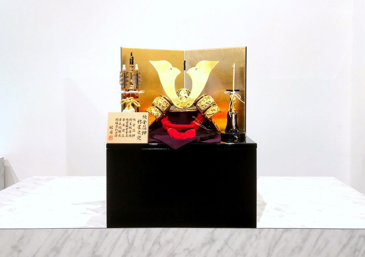 また、あえて装飾なく黒一色に塗られた収納台と輝く金箔の屏風が、兜の重厚さをより深めている高級感ある飾りとなっています。