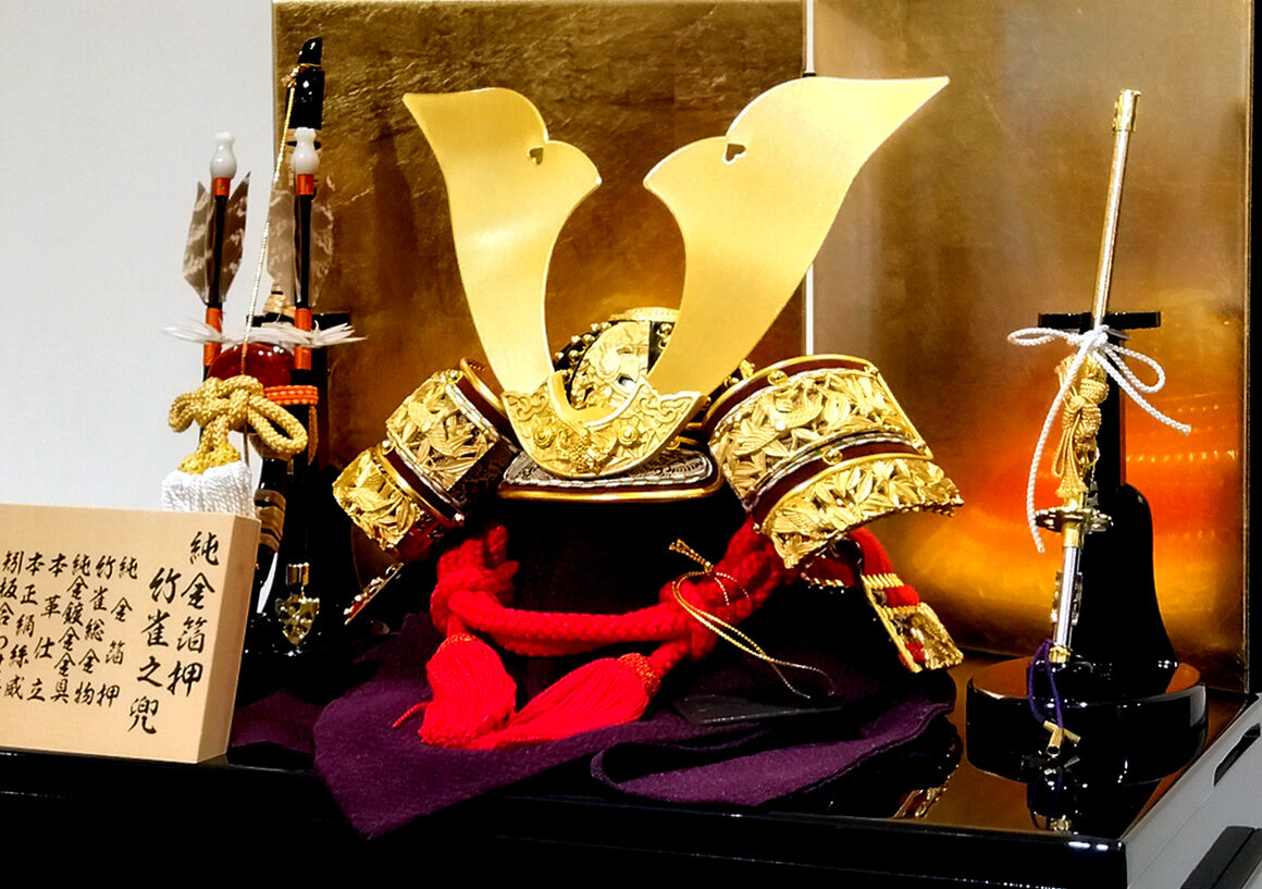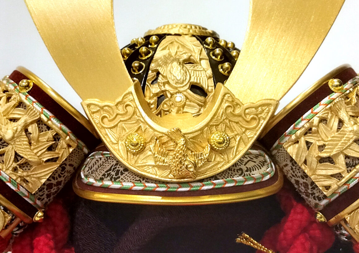奈良の春日大社所蔵の国宝「赤糸威大鎧(竹虎雀飾)」を再現した兜飾りです。見事な飾り金物には純金鍍金が施されており純金箔押小札や剝ぎ合わせの鉢等、贅を凝らした兜になっています。