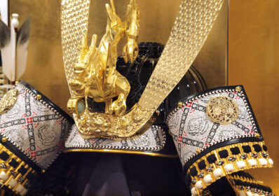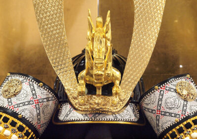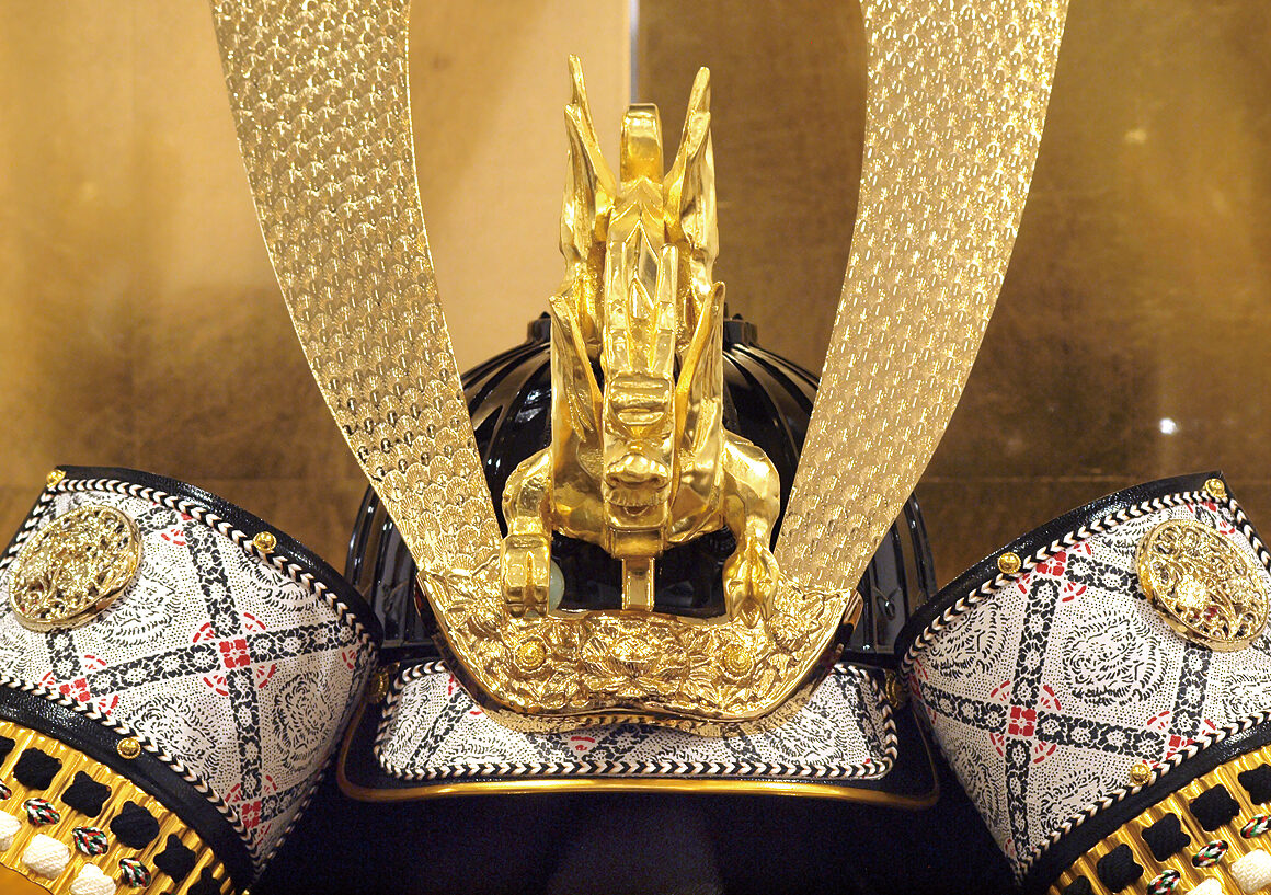 兜の中央に取り付けられた大きな竜頭は木彫り金箔押になっています。龍は登竜門の故事成語にあるように立身出世の象徴であり、また右手に持つ宝珠はあらゆる願いを叶えるといわれる縁起物です。