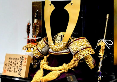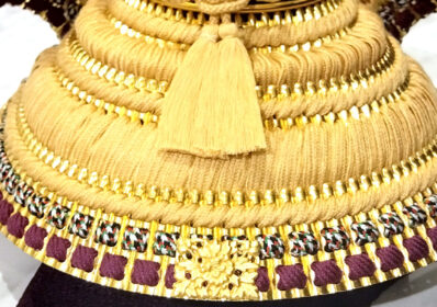 小札に純金箔押しされた兜が美しく輝き、緋縅の配色が高級感を漂わせる逸品です。