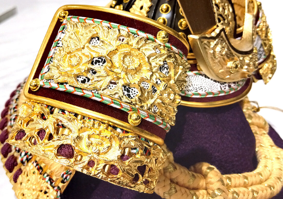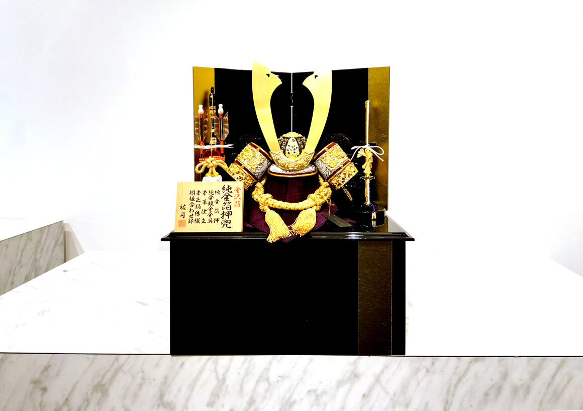 小札に純金箔押しされた兜が美しく輝き、緋縅の配色が高級感を漂わせる逸品です。