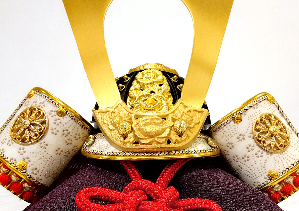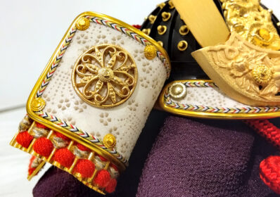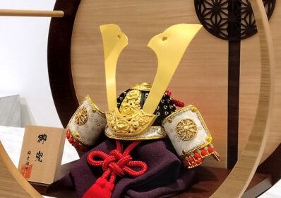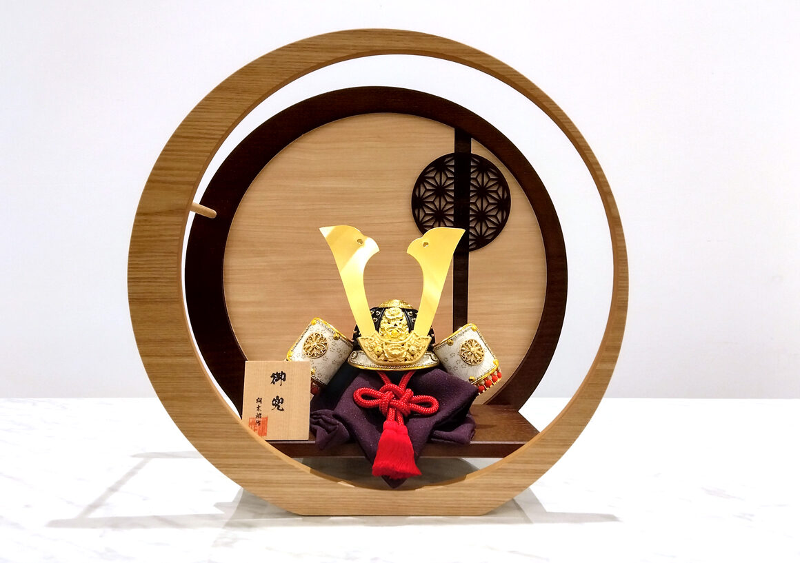 おしゃれなオブジェのような円形の飾り台が特徴的な逸品です。兜は、正絹を縅に使用し、精巧な合わせ鉢になっており、細部までこだわりが感じられます。飾り台はナチュラルな白木調で、どんなお部屋にも馴染みやすく、インテリアのように飾ることができます。