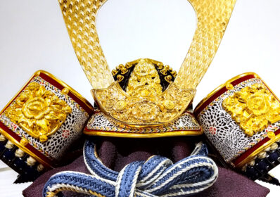 紺と白の縅色が美しく、頭部の鉢は短冊状の板を幾重にも重ね合わせ美しい丸型に仕上げた合わせ鉢になっています。コンパクトな木目調の飾り台と合わせ、シンプルですが重厚感ある兜飾りとなっています。