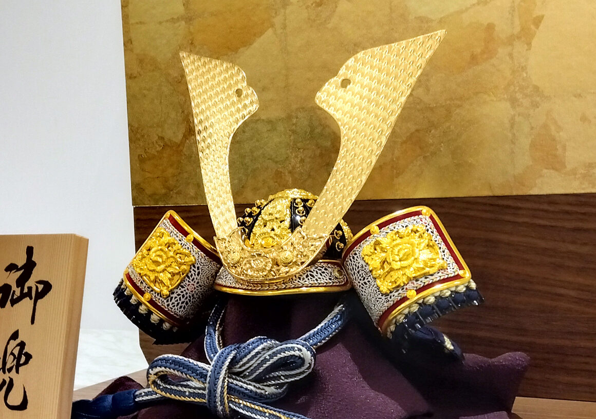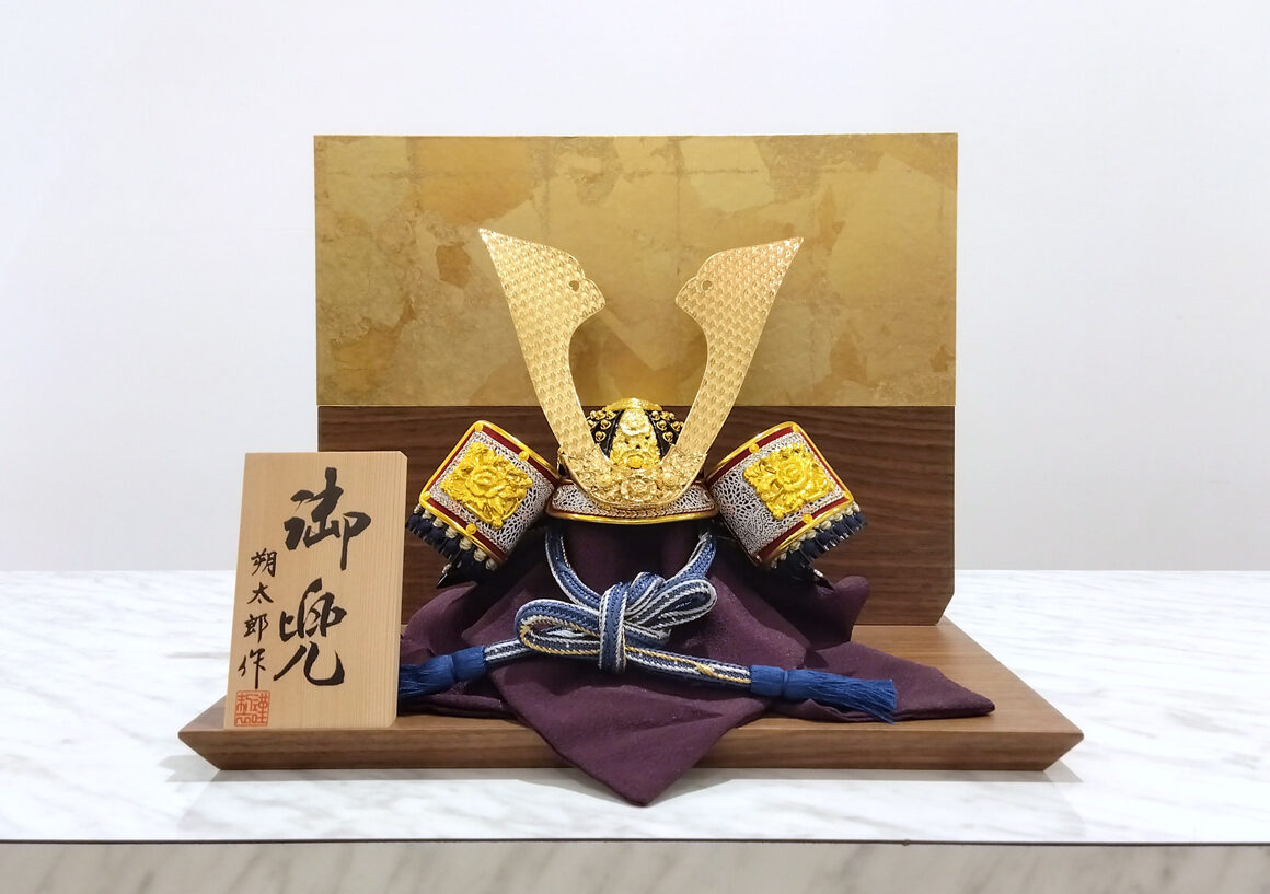 紺と白の縅色が美しく、頭部の鉢は短冊状の板を幾重にも重ね合わせ美しい丸型に仕上げた合わせ鉢になっています。コンパクトな木目調の飾り台と合わせ、シンプルですが重厚感ある兜飾りとなっています。