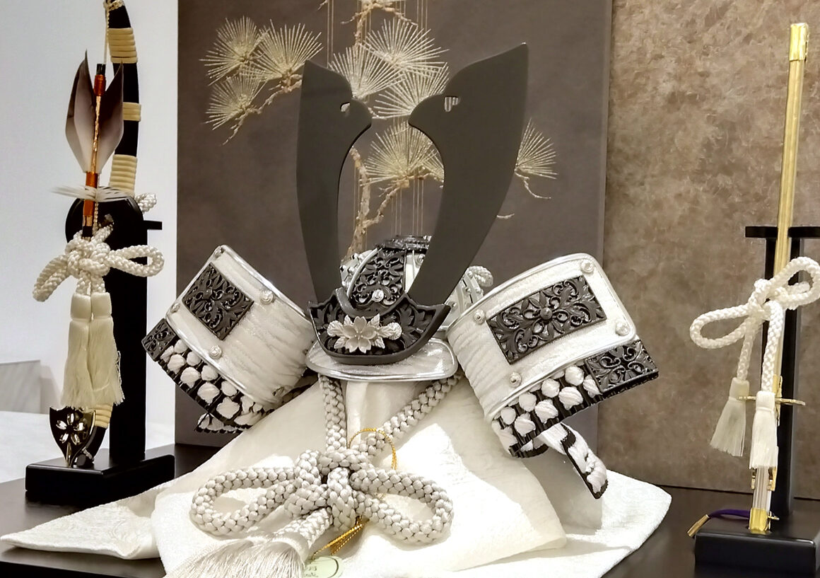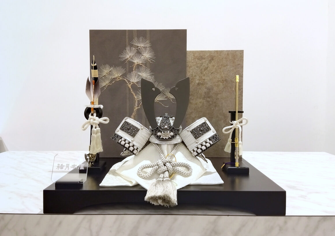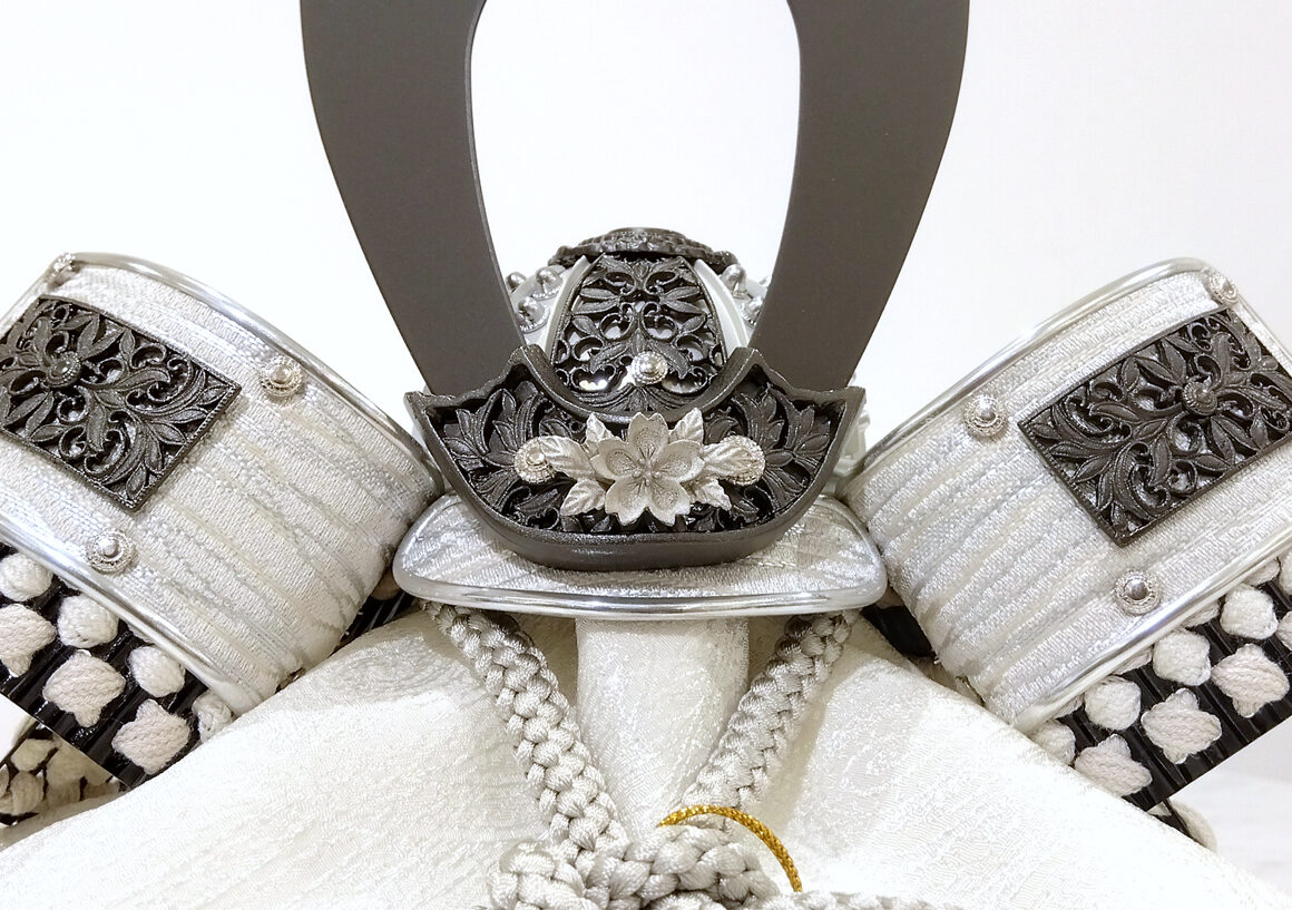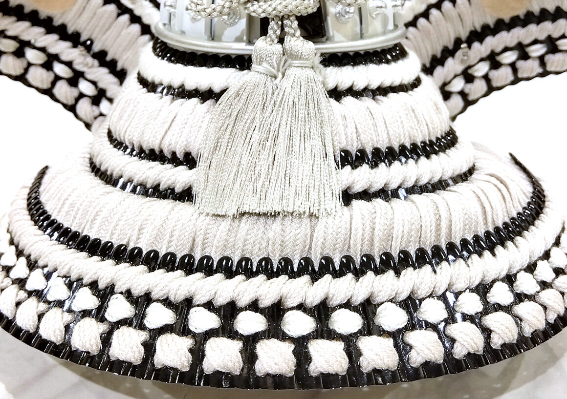 白と黒の配色が絶妙に調和し、繊細なディテールが魅力的な兜になっており、正絹縅や合わせ鉢等、職人の技術が光る逸品となっています。グレーとシルバー基調の飾り台がモノトーンな兜をさらに際立たせています。