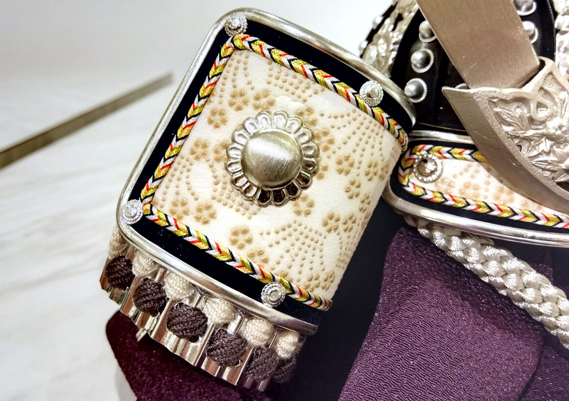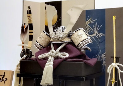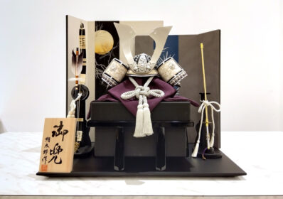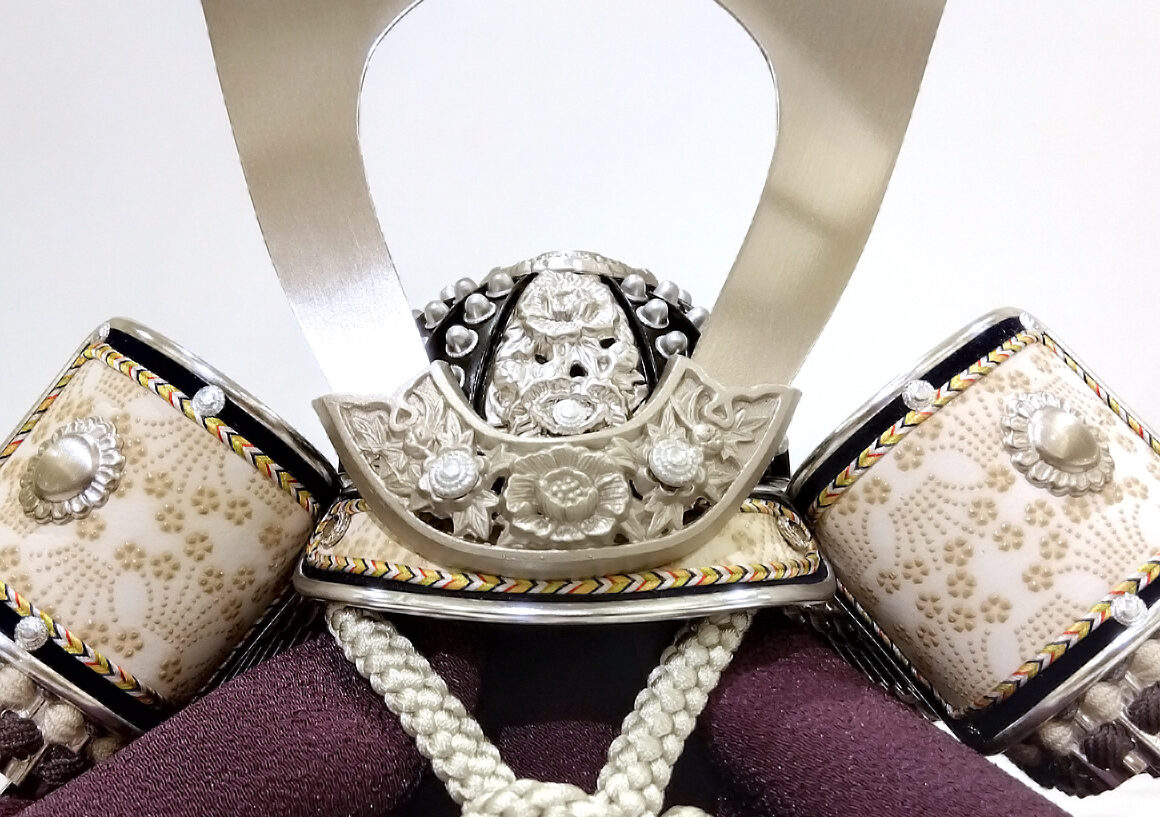 洗練されたシルバーカラーの兜で吹き返しには上質な印伝革が使用され、伝統とモダンが見事に融合した逸品となっています。正絹縅や合わせ鉢等手の込んだ造りになっており、職人の技が光る兜です。さらに、飾り台は2枚構成のお屏風がシックなデザインで兜を引き立てスタイリッシュな兜飾りとなっています。